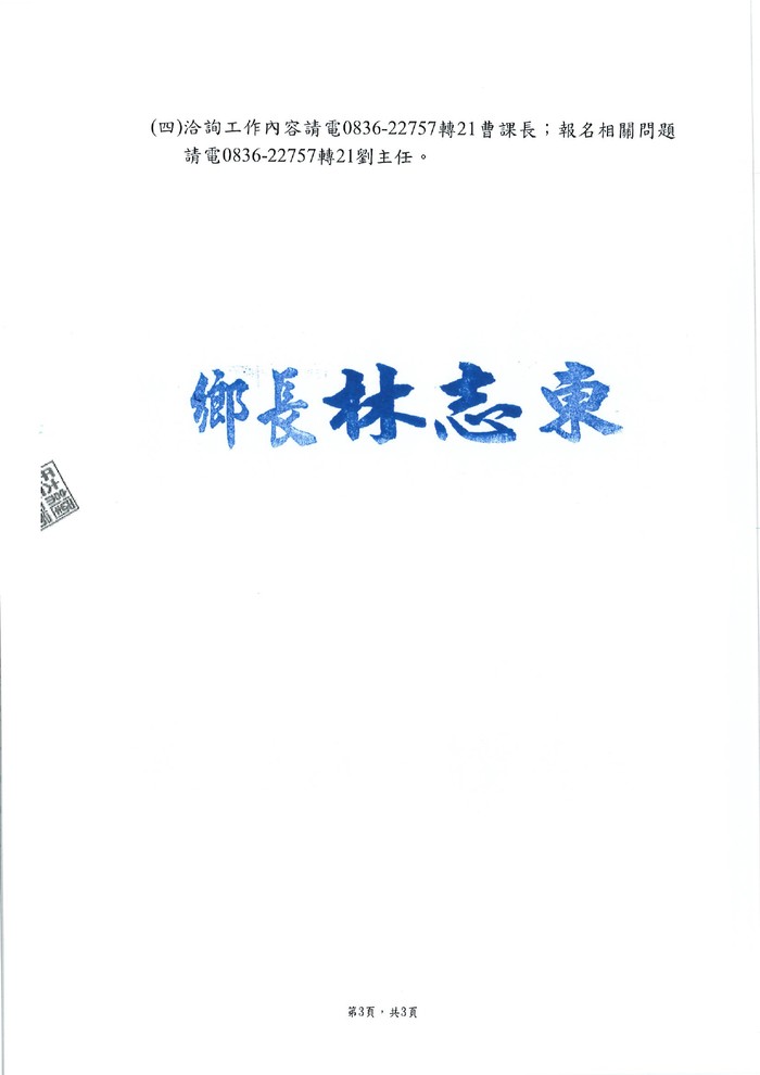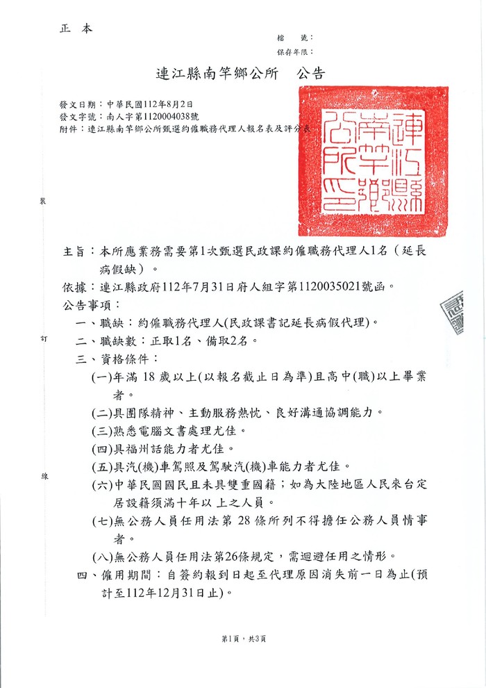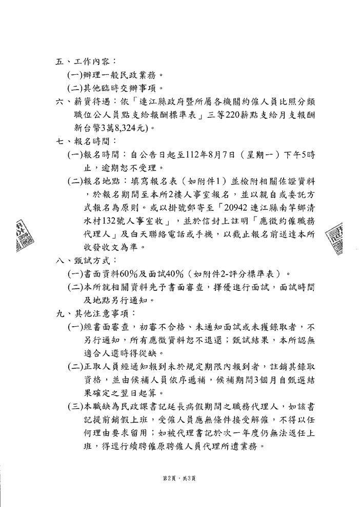 南竿鄉公所徵選民政課約僱職務代理人1名