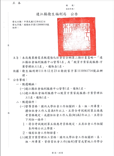 衛福局徵選強化社安網督導及脫貧方案社工人員
