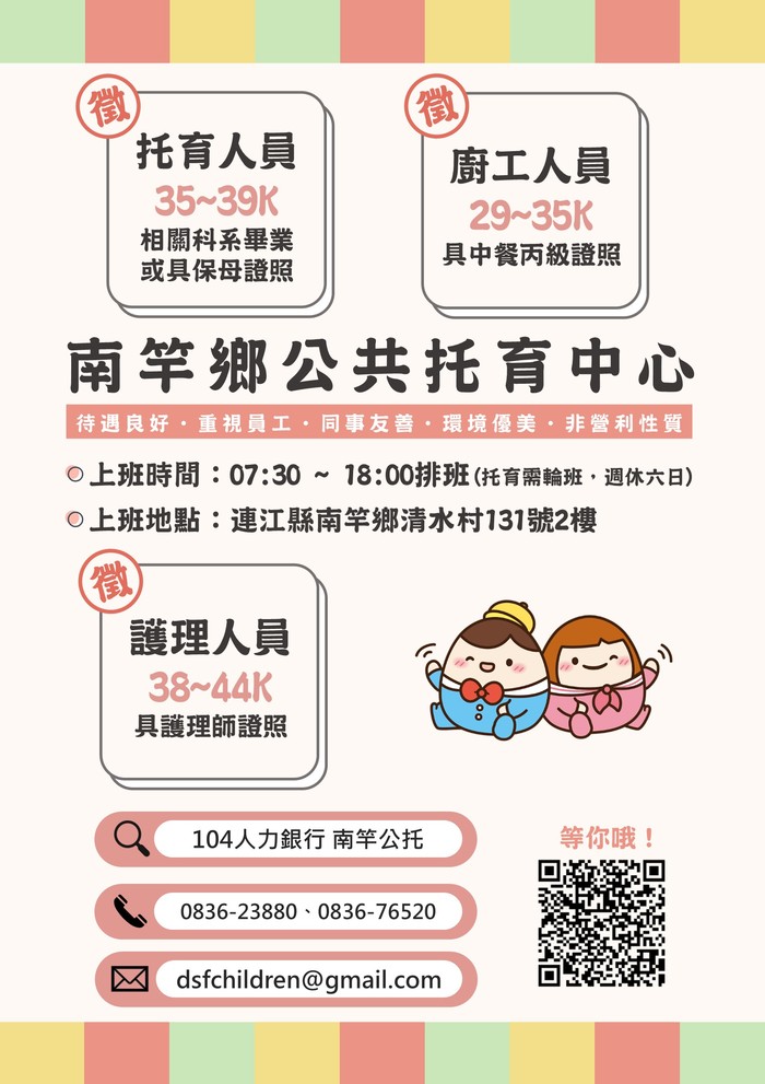 徵 托育人員【南竿鄉公共托育中心(托嬰中心)】 --閱讀人次 : 977 南竿鄉公共托育中心(托嬰中心)