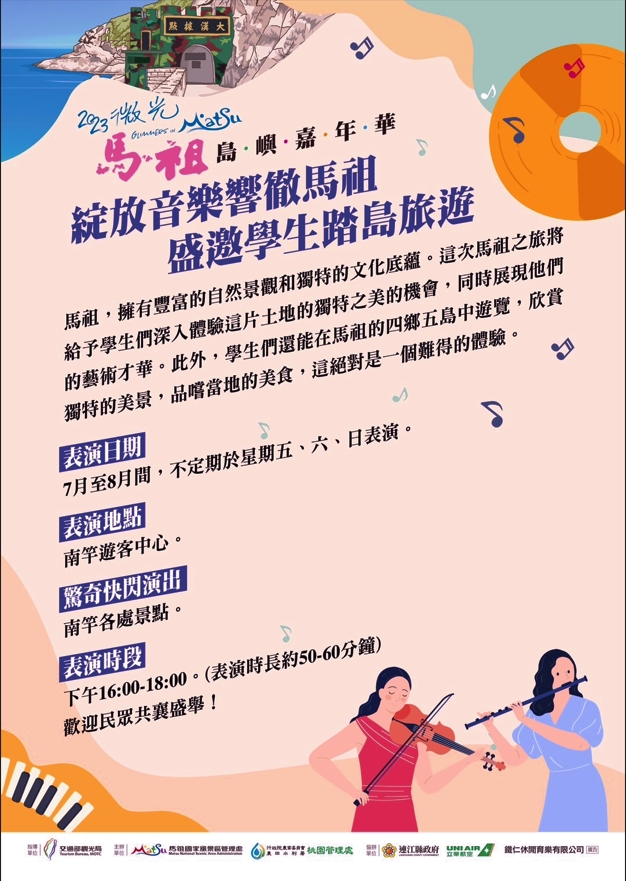 演出活動將從8月9日(三)至8月15日(二)接連至東引、南竿、莒光、北竿登場演出,歡迎大家至現場聆聽。