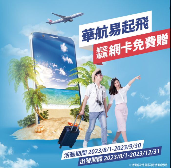 活動辦法:購買中華航空/華信航空 桃園機場(TPE)出發不限航點成人來回機票贈送每筆訂單上網卡乙張。