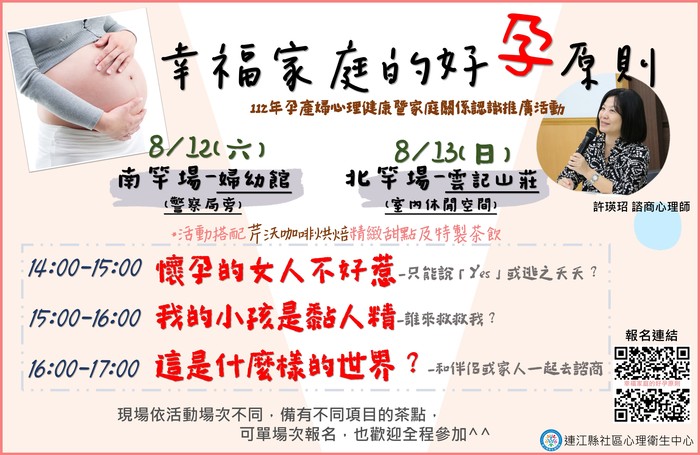 幸福家庭的好孕原則-心理健康推廣活動 --閱讀人次 : 563 在馬祖這片土地上,關係緊密卻又保守,有著許多孕產期間堅強不知自身壓力的婦女,也有一些身為伴侶卻獨自拼湊著破碎的關係⋯⋯