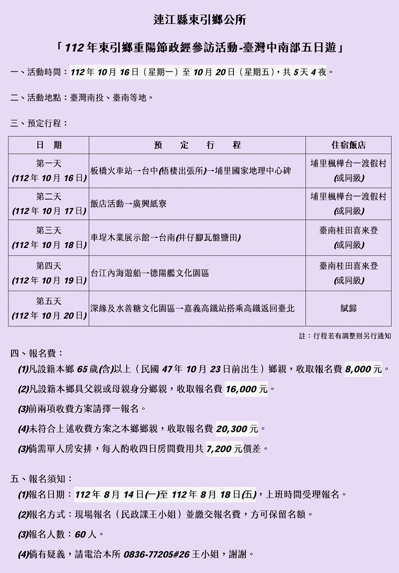 東引鄉重陽節政經參訪台灣中南部5日遊