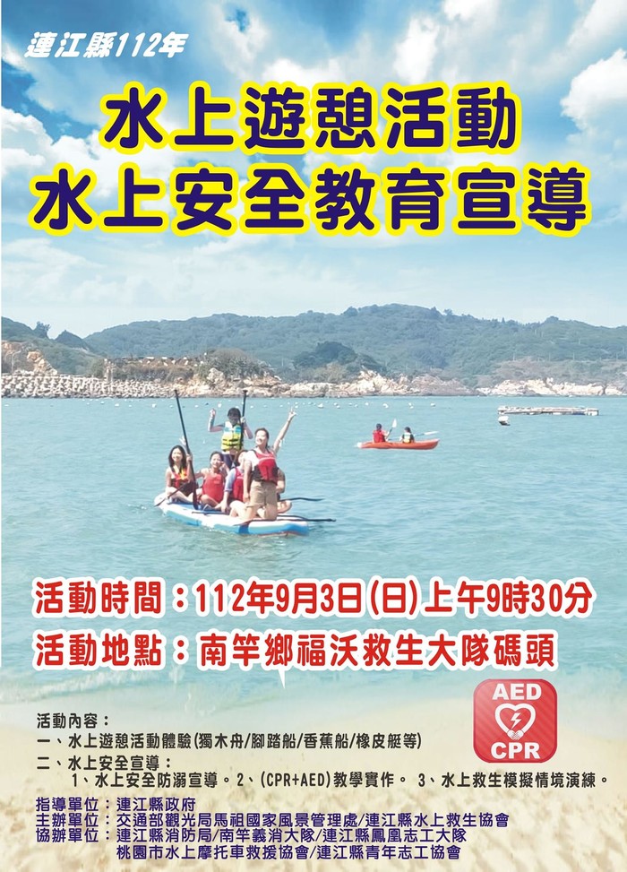 112年水上遊憩暨水上安全教育宣導活動 --閱讀人次 : 21904 壹、活動宗旨:馬祖四面環海,且擁有廣大的海域面積。炎炎夏日暑假期間,從事水上活動之民眾將增多,為讓民眾可以體驗多元化的水上遊憩活動,並加強宣導水域安全的重要性,特辦理此活動。