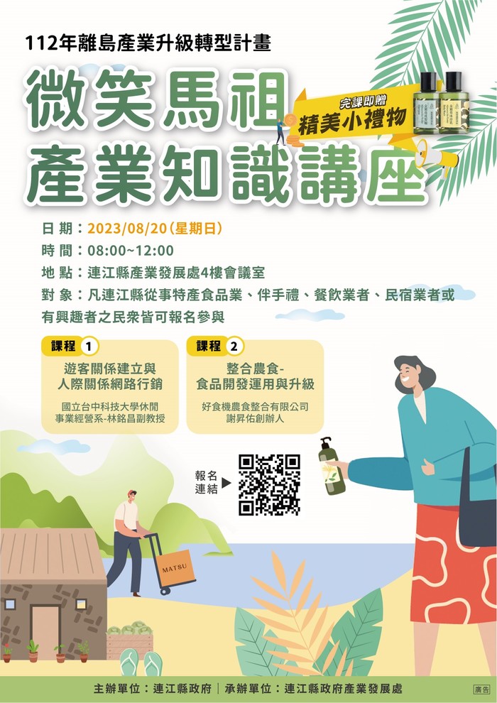 微笑馬祖-產業知識講座開講囉! --閱讀人次 : 866 您想要有溫度的產品嗎?打動人心的故事行銷?加入微笑馬祖講座,為這片的土地增添更多創新經濟,共創島嶼產業品牌競爭力!由連江縣政府主辦「112年離島產業升級轉型計畫」,鎖定馬祖的核心產業及觀光勝地,深耕食品製造業與旅宿業,分享產業知識與案例,開創嶄新市場!