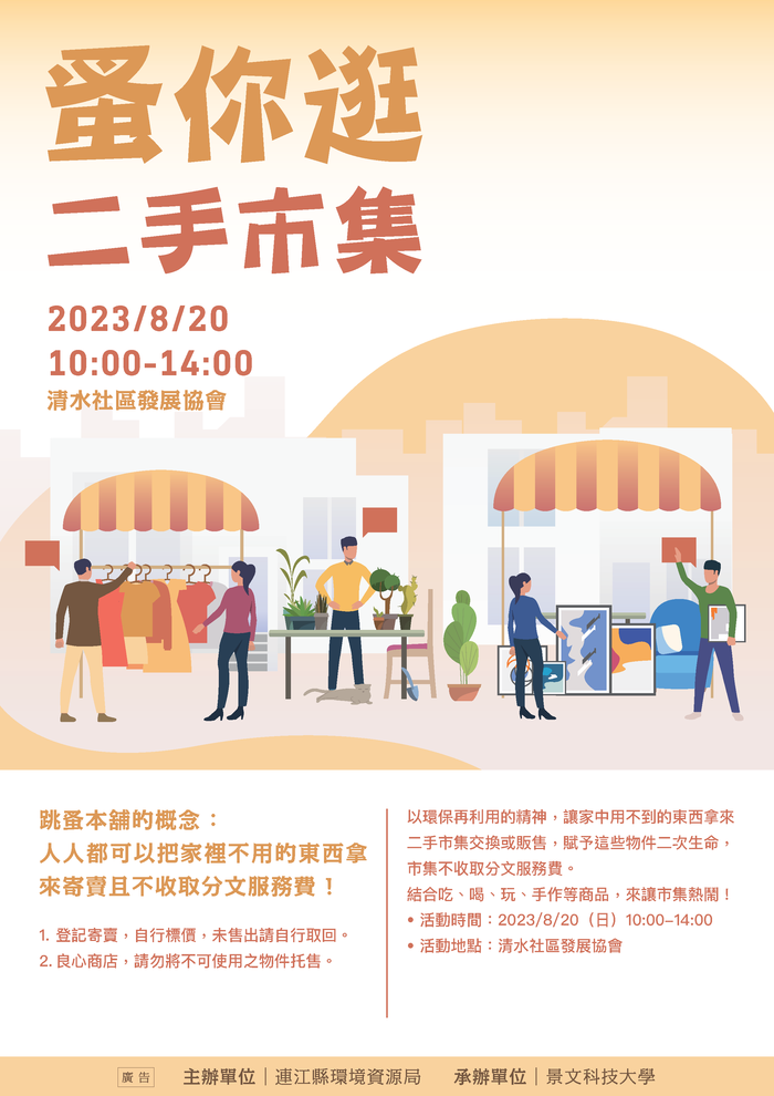 《蚤你逛二手市集》 --閱讀人次 : 1327 由連江縣環境資源局舉辦的「蚤你逛二手市集」將於8月20日(日)上午10點至下午2點於南竿鄉清水村社區發展協會(白馬尊王廟F2)舉辦,環資局將邀請二手物品攤位業者至現場設攤,希望藉此推廣資源循環再利用、減廢等環保理念,以環保再利用的精神,讓家中用不到的東西拿來二手市集交換或販售,賦予這些物件二次生命。除此之外,還結合了吃、喝、玩、手作等攤位,歡迎鄉親踴躍參與。