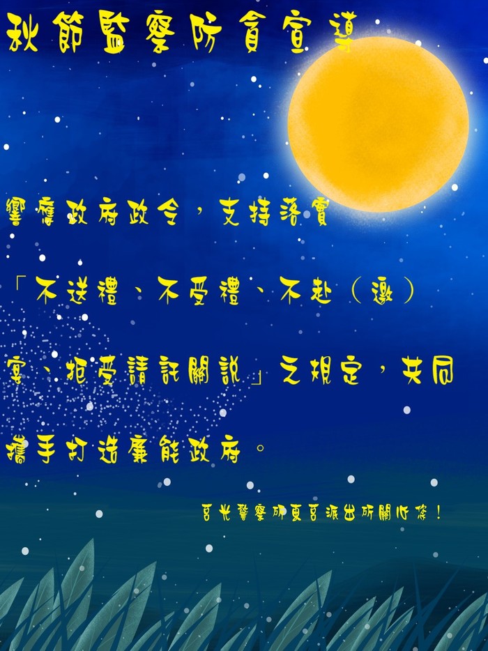 連江縣警察局112年度中秋節監察防貪專案實施期程自112年9月17日起至10月1日止,為貫徹公務員廉政倫理規範要求,革除不當受贈財物、飲宴應酬、請託關說等陋習,端正警察風紀,樹立廉能政風,以建構優質公務環境,提升警察良好形象請民眾響應政府政令,支持落實「不送禮、不受禮、不赴(邀)宴、拒受請託關說」之規定,共同攜手打造廉能政府。 莒光警察所東莒派出所關心您!