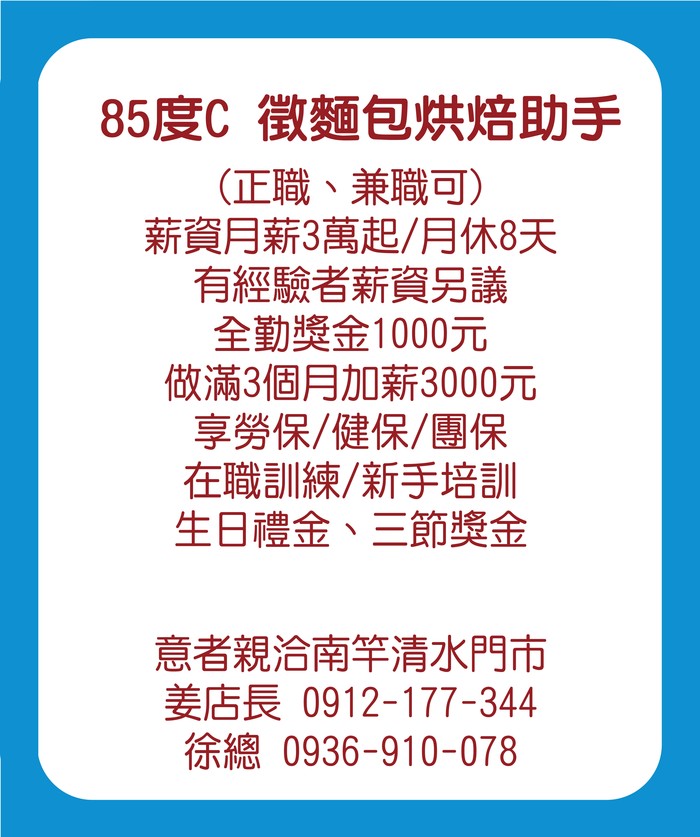 誠徵麵包烘焙助手(正職、兼職可)~85度C咖啡