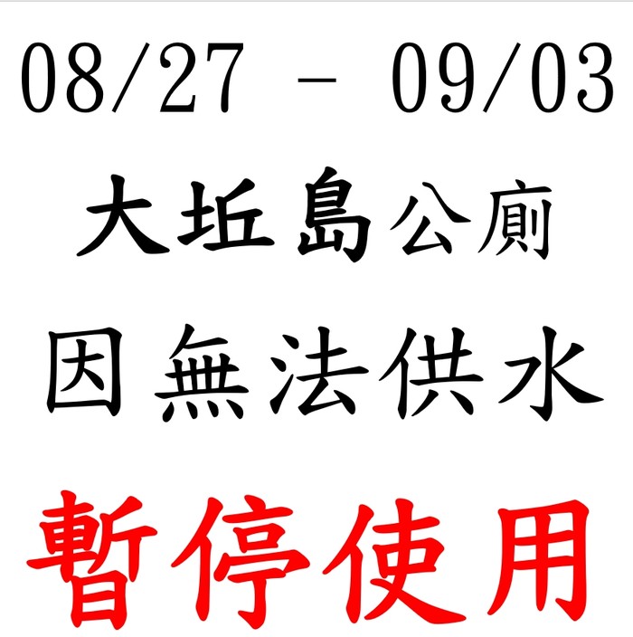 目前大坵島上公廁,因無法供水而正在進行檢修,無法使用。