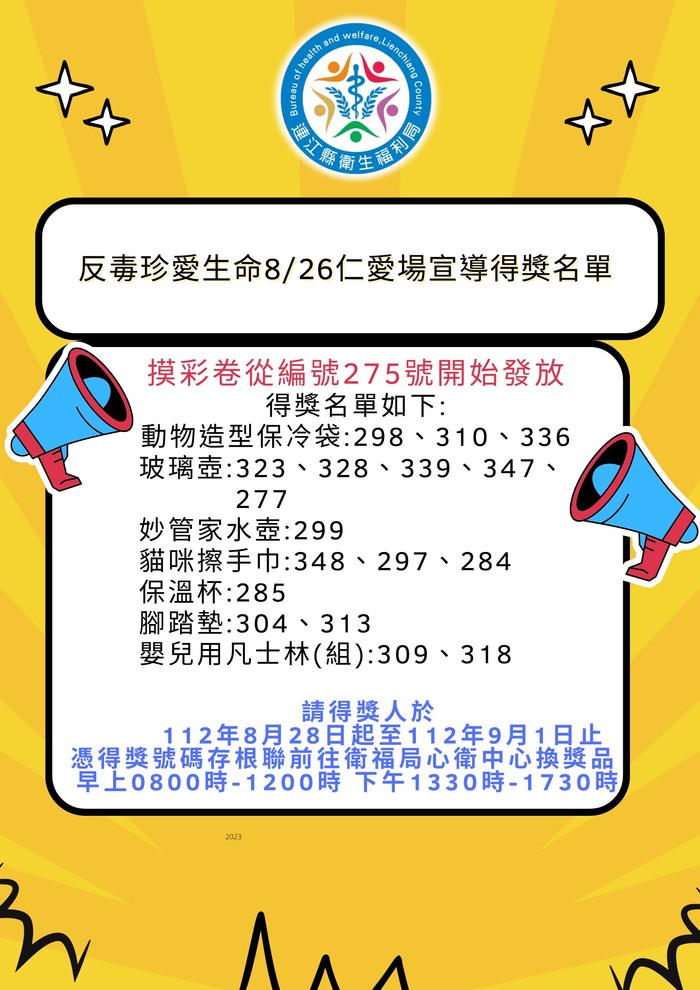 反毒珍愛生命8/26仁愛場宣導活動得獎名單
