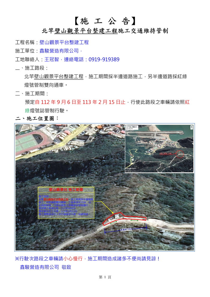 工地聯絡人:王冠智,連絡電話:0919-919389
