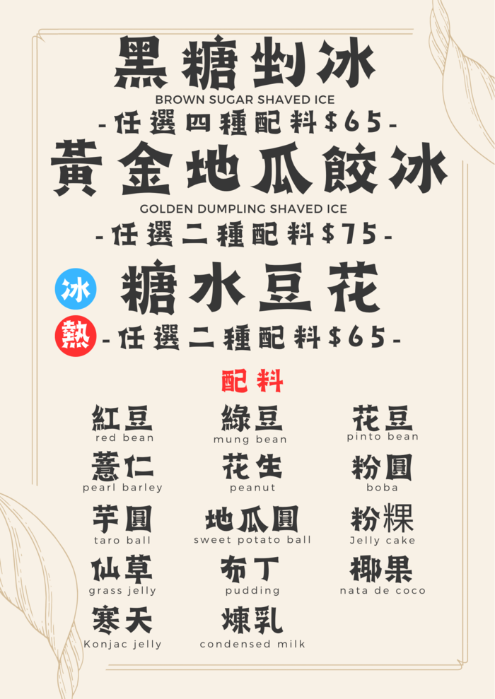 冰/熱-糖水豆花一碗$65