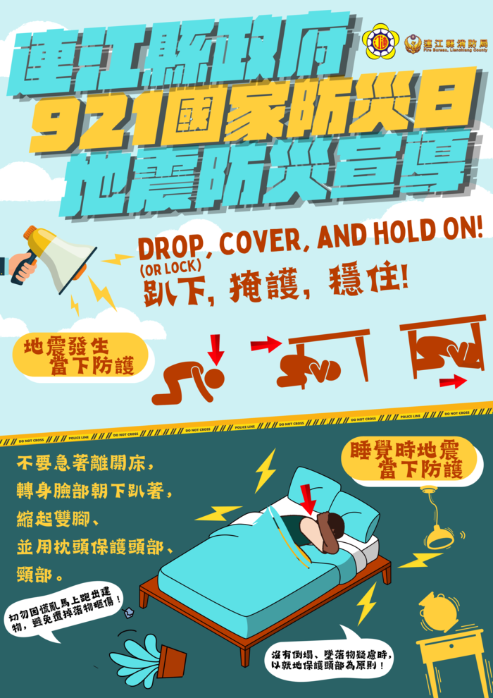 連江縣消防局提醒民眾牢記:趴下(Drop) 【固定 Lock】、掩護(Cover)、穩住(Holdon)口訣!並於睡前注意不要睡在電視、書架等大型家具前,事先將手機放在隨手可及的地方,手電筒放置床邊,在床邊備好拖鞋或鞋子,以防震後誤踩尖銳物品而受傷。若地震時正躺在床上,也不要急著離開床,應轉身將臉部朝下趴著縮起雙腳,並用枕頭保護自己的頭部、頸部,直到搖晃停止;把握最佳反應時間,即能確保平安。