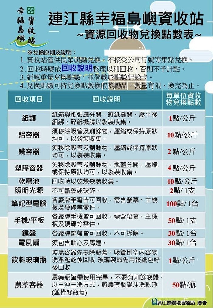 鄉親可攜帶資源回收物,如紙類、鋁容器(鋁罐)、鐵容器(鐵罐)、塑膠容器(PET、PVC、PS)、乾電池、燈泡/燈管、可攜式電腦、廢手機/平板、廢鍵盤、廢電風扇、飲料玻璃瓶、廢農藥容器等到幸福島嶼資收站,將資收物兌換成點數,所累積的點數將紀錄在「幸福島嶼存摺」中,當達到一定點數即可兌換等價的民生用品。兌換點數、兌換獎品規則詳見連江縣環境資源局活動訊息官網(http://www.matsuerb.gov.tw/)或幸福島嶼資收站公告。