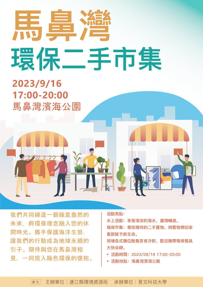 連江縣環資局將於 9/16下午17:00-20:00於馬鼻灣水域辦理遊憩活動兼假日環保二手市集。