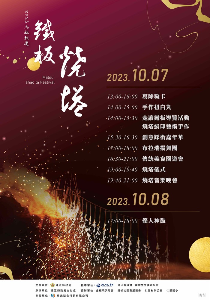 今年燒塔節將結合國際藝術島活動,於10月7日-8日舉辦,活動從7日下午1點開始,包含扭白丸體驗、創意踩街競演、燒塔絹印藝術手作、走讀鐵板聚落導覽解說、特色美食園遊會、鐵板中秋慶團圓、燒塔儀式及燒塔音樂晚會,還有享譽國際的布拉瑞揚舞團及優人神鼓精彩的節目。鐵板社區歡迎鄉親一起來除穢迎接正能量,祈願平安順心。