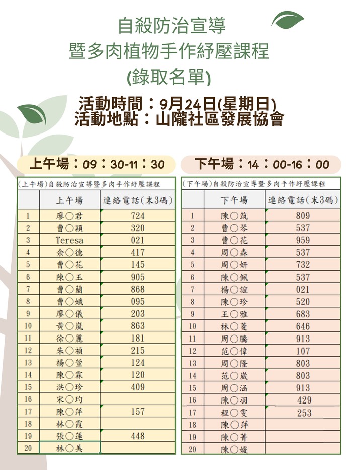 0924自殺防治宣導暨多肉課程名單更新