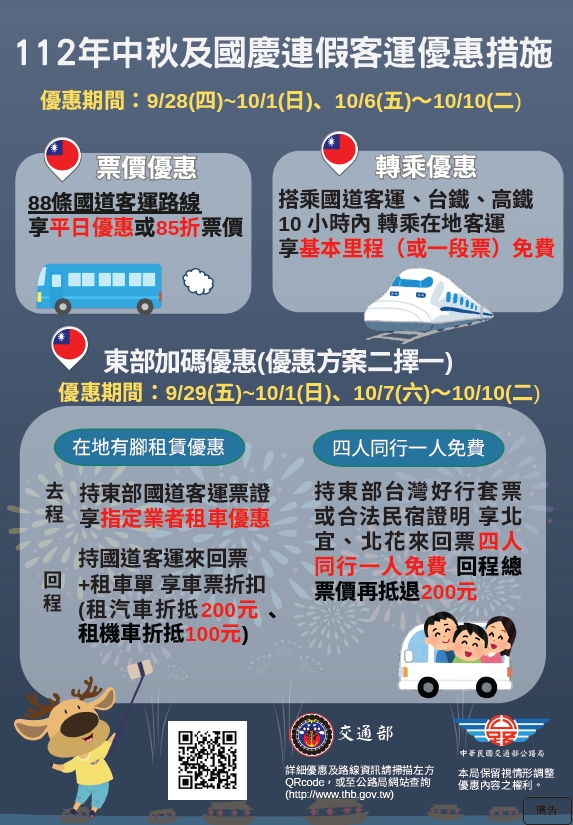 為了鼓勵民眾多家利用大眾運輸工具,公路局自連假前一日112年9月28日0時起至112年10月1日24時止推出多項全國性共通國道(公路)客運優惠,提供返鄉及出遊旅客選擇,包括客運業者實施88條中長途國道客運路線享平日票價或原票價85折優惠。另外在轉乘優惠部分,舉凡搭乘高鐵、臺鐵及國道客運後10小時內使用電子票證轉乘在地客運均可享有1段票(或基本里程)免費優惠。另外針對前往臺灣東部區域民眾,享有「在地有腳」租賃優惠,搭乘指定東部國道客運路線享租車優惠,回程持租賃汽機車憑證享國道客運車票優惠(租汽車者折抵200元,租機車者折抵100元),而持東部合法旅宿業住宿憑證或台灣好行套票,搭乘東部國道客運享4人同行1人免費,回程再折抵200元。(與在地有腳租賃優惠擇一使用)
