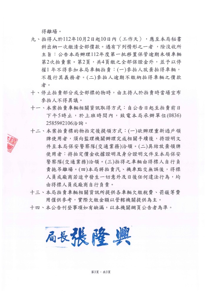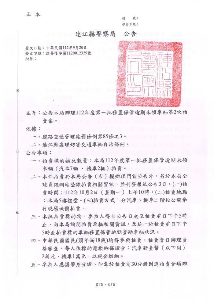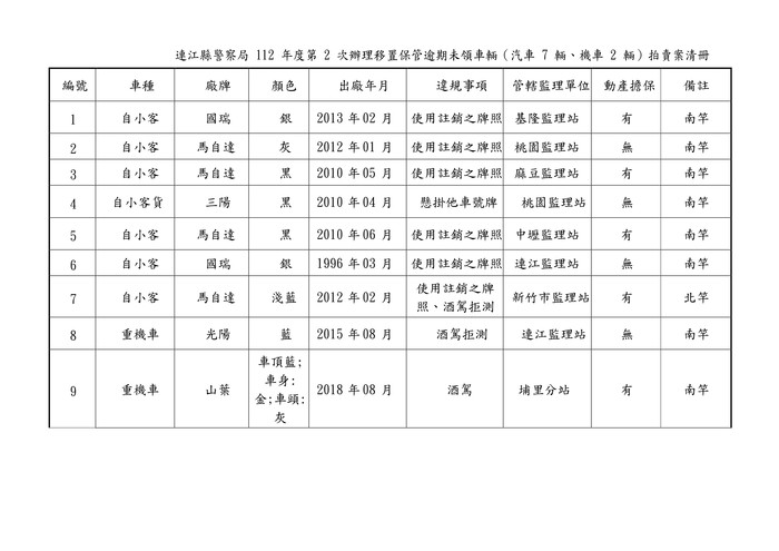 縣警局辦理112年度第2次移置保管逾期未領車輛拍賣公告