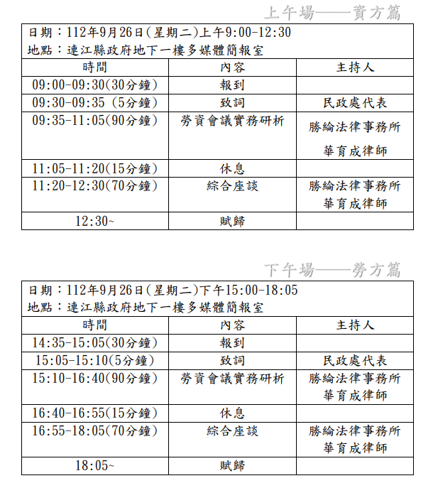民政處辦推動勞資會議工作坊9/26 --閱讀人次 : 600 連江縣政府民政處將於112年9月26日(星期二)舉辦「推動勞資會議機制工作坊」,時間上午9:00-12:30(資方場) 、下午15:00-18:05(勞方場),舉辦地點:連江縣政府地下一樓多媒體簡報。