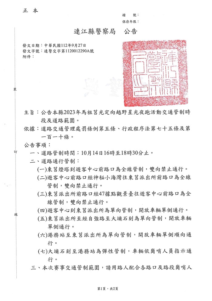 2023年馬祖莒光定向越野星光夜跑活動交通管制公告