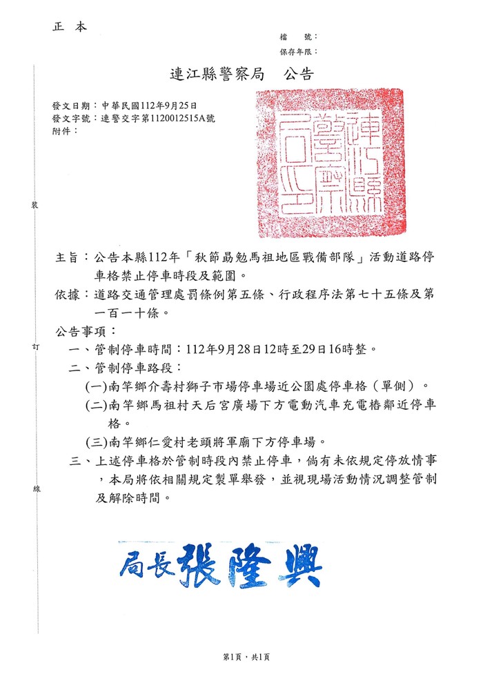 112年「秋節勗勉馬祖地區戰備部隊」活動交通管制公告