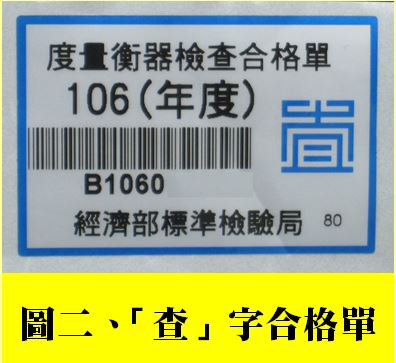 為確保民眾消費之權益,市場使用之磅秤必須經經濟部標準檢驗局檢定合格才可供計量交易使用,檢定合格的磅秤會黏貼「同」字檢定合格單(如相關照片圖一)。該局每年亦會針對市場使用中磅秤進行抽檢,檢查合格會黏貼「查」字合格單(如相關照片圖二)。