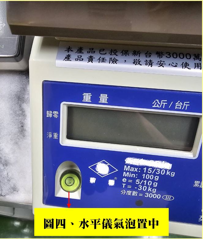 2. 多數計價電子磅秤附有氣泡式水平儀,其氣泡是否置中(如相關照片圖四)。