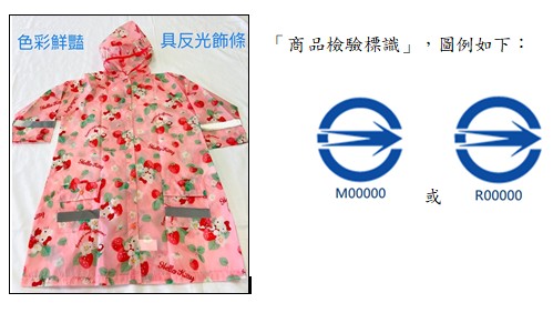 1. 選購兒童雨衣時應挑選經標準檢驗局檢驗合格之商品,該商品上應有「商品檢驗標識」,圖例如相關照片。