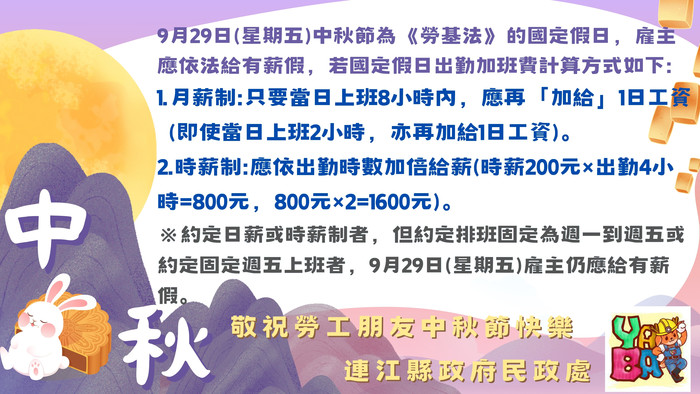 民政處中秋節國定假日出勤權益宣導 --閱讀人次 : 801 112年9月29日(星期五)中秋節為《勞基法》的國定假日,雇主依法應給有薪假!!!