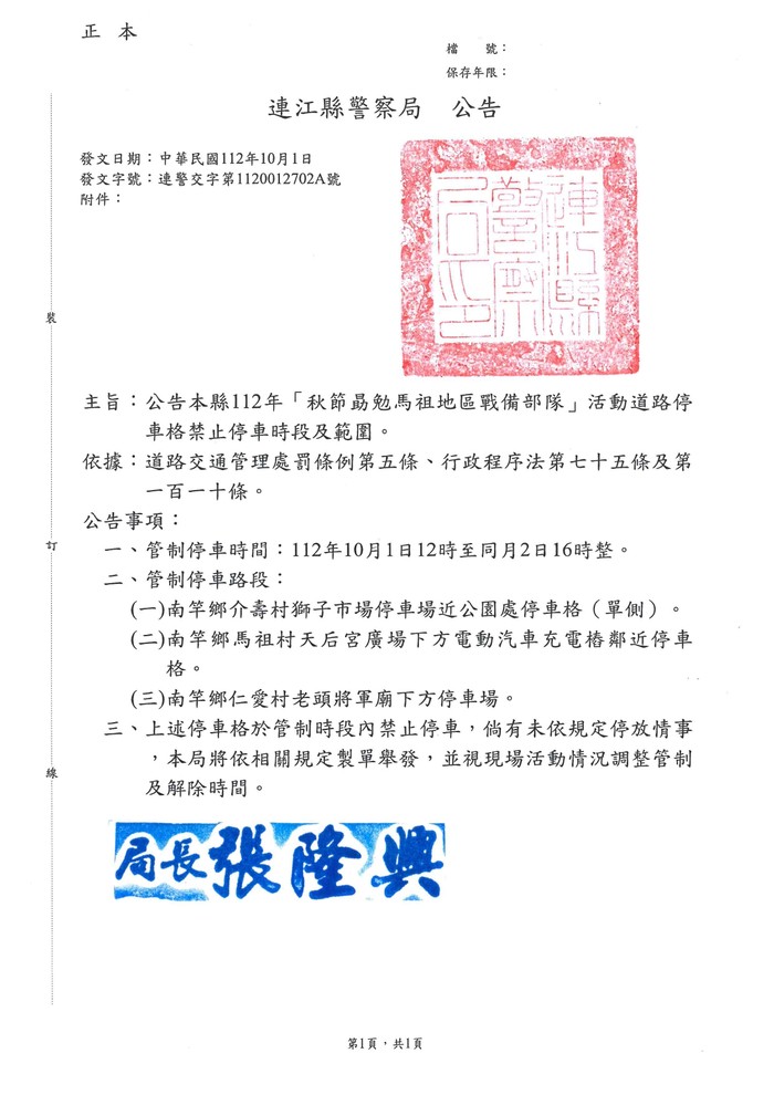 112年「秋節勗勉馬祖地區戰備部隊」活動交通管制公告