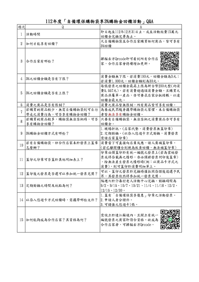 環資局為加強推廣購物自備購物袋,減少一次性購物袋及塑膠袋使用,鼓勵商家、連鎖便利超商提供折扣給自備環保袋之消費者,希望鄉親配合購物自備購物袋環保行為。鄉親憑消費發票折抵採購物品總價3%之消費額度。