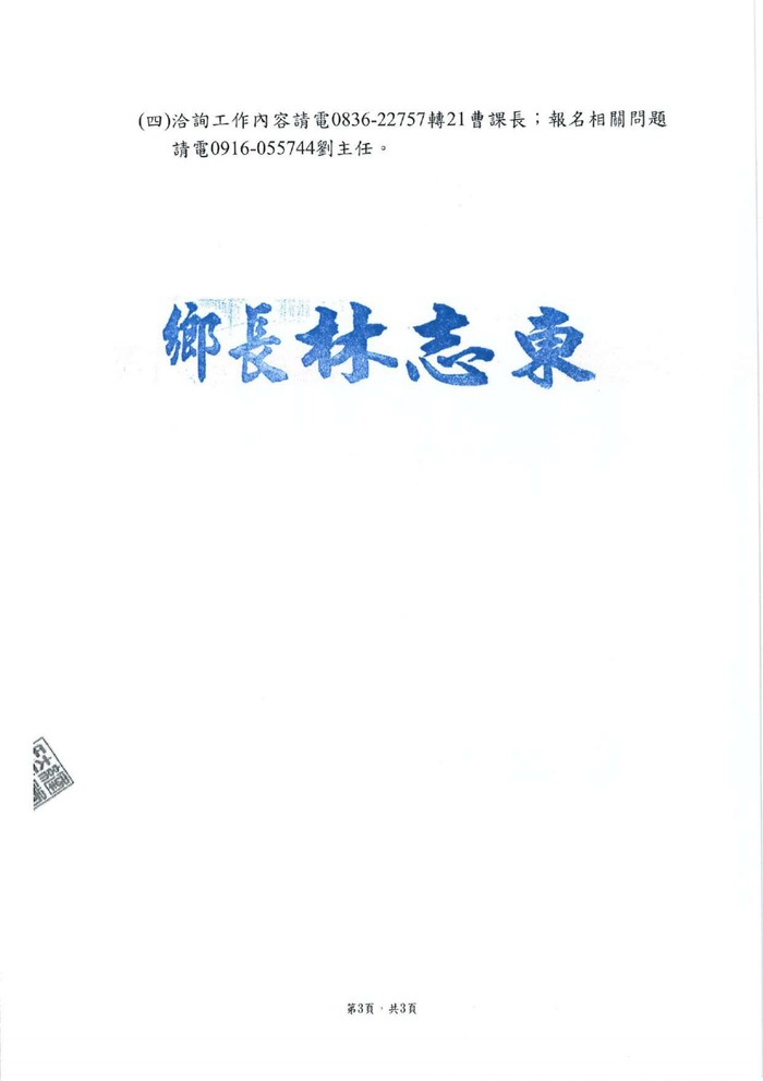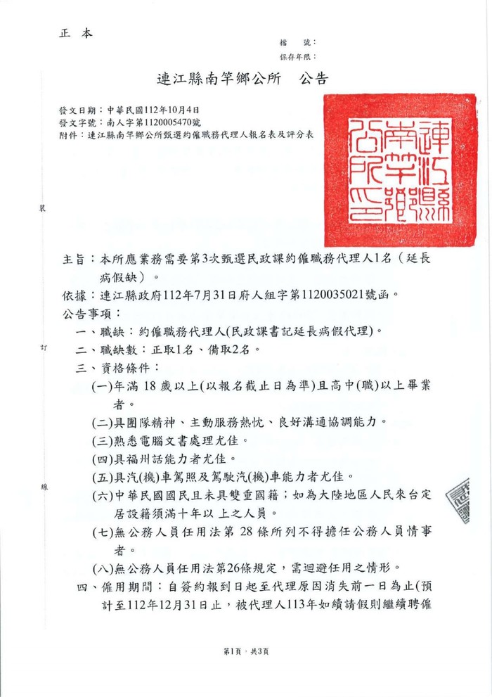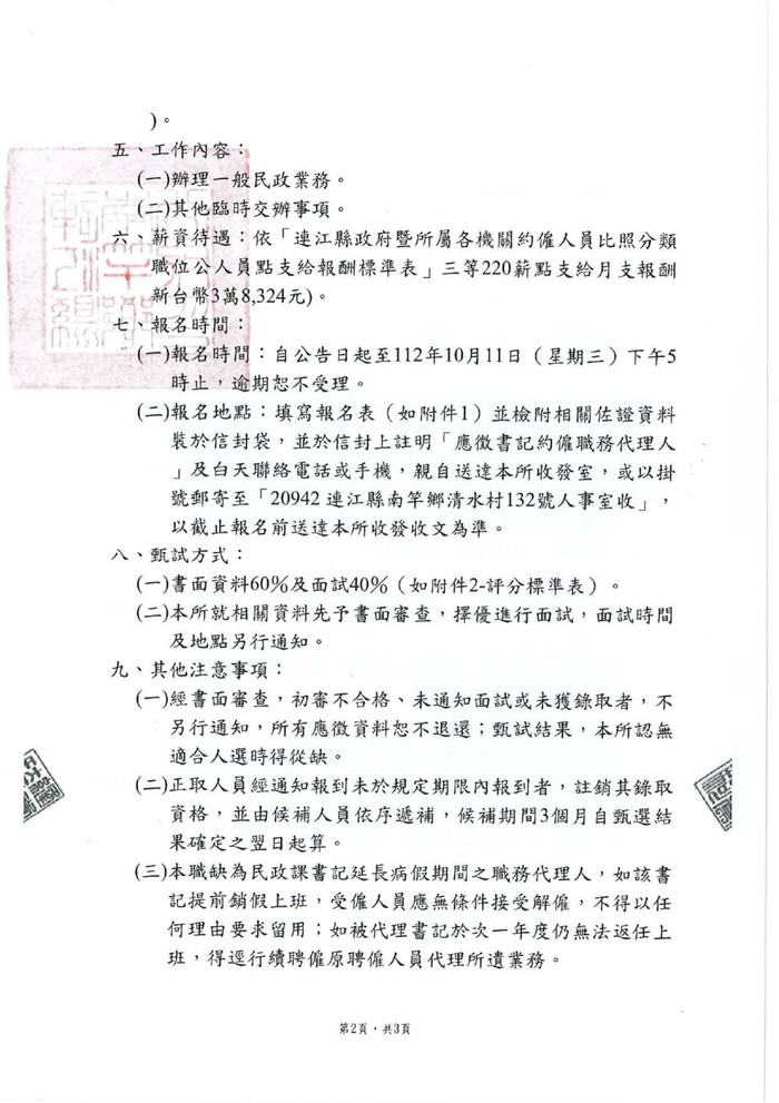 南竿鄉公所甄選約僱職務代理人1名(第3次公告)