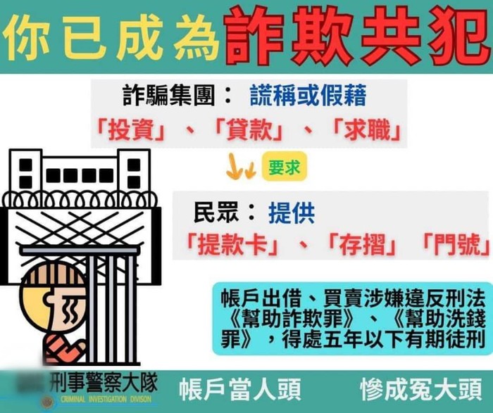 帳戶出借、買賣涉嫌違反刑法《幫助詐欺罪》、《幫助洗錢罪》,得處五年以下有期徒刑。