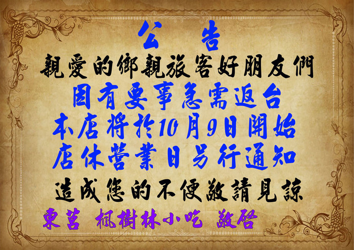 東莒楓樹林小吃10/9起店休