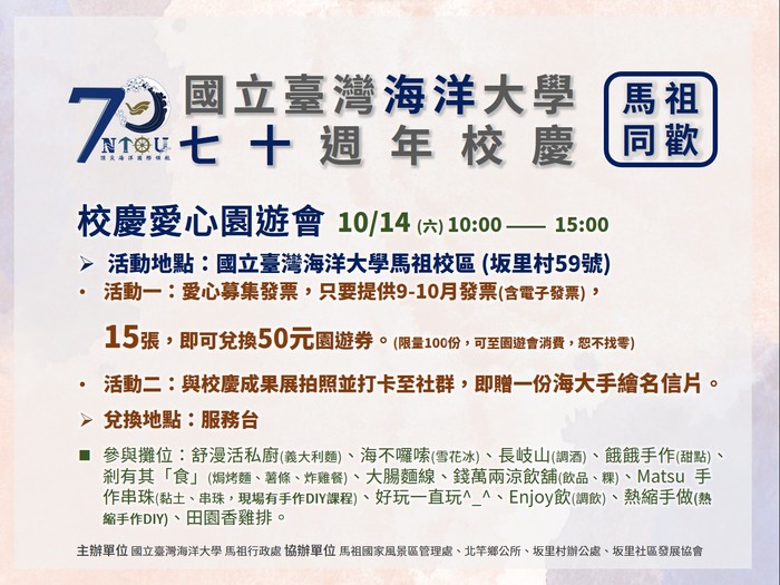 【發票換園遊券】1014海大校慶園遊會 --閱讀人次 : 848 校慶愛心園遊會 10/14 (六) 10:00 — 15:00