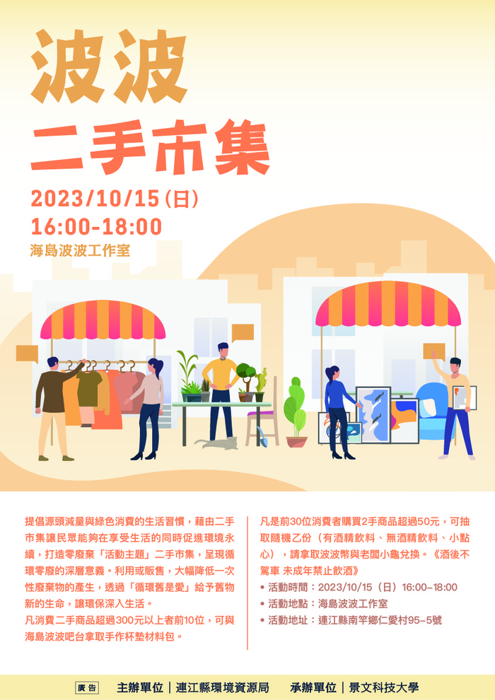 10/15《波波二手市集》 --閱讀人次 : 888 由連江縣環境資源局舉辦的「波波二手市集」將於10月15日(日)下午4點至6點於南竿鄉仁愛村海島波波工作室舉辦,環資局將邀請二手物品攤位業者至現場設攤,希望藉此提倡源頭減量與綠色消費的生活習慣,藉由二手市集讓民眾能夠在享受生活的同時促進環境永續,打造零廢棄「活動主題」二手市集,呈現循環零廢的深層意義。利用或販售,大幅降低一次性廢棄物的產生,透過「循環舊是愛」給予舊物新的生命,讓環保深入生活,歡迎鄉親踴躍參與。