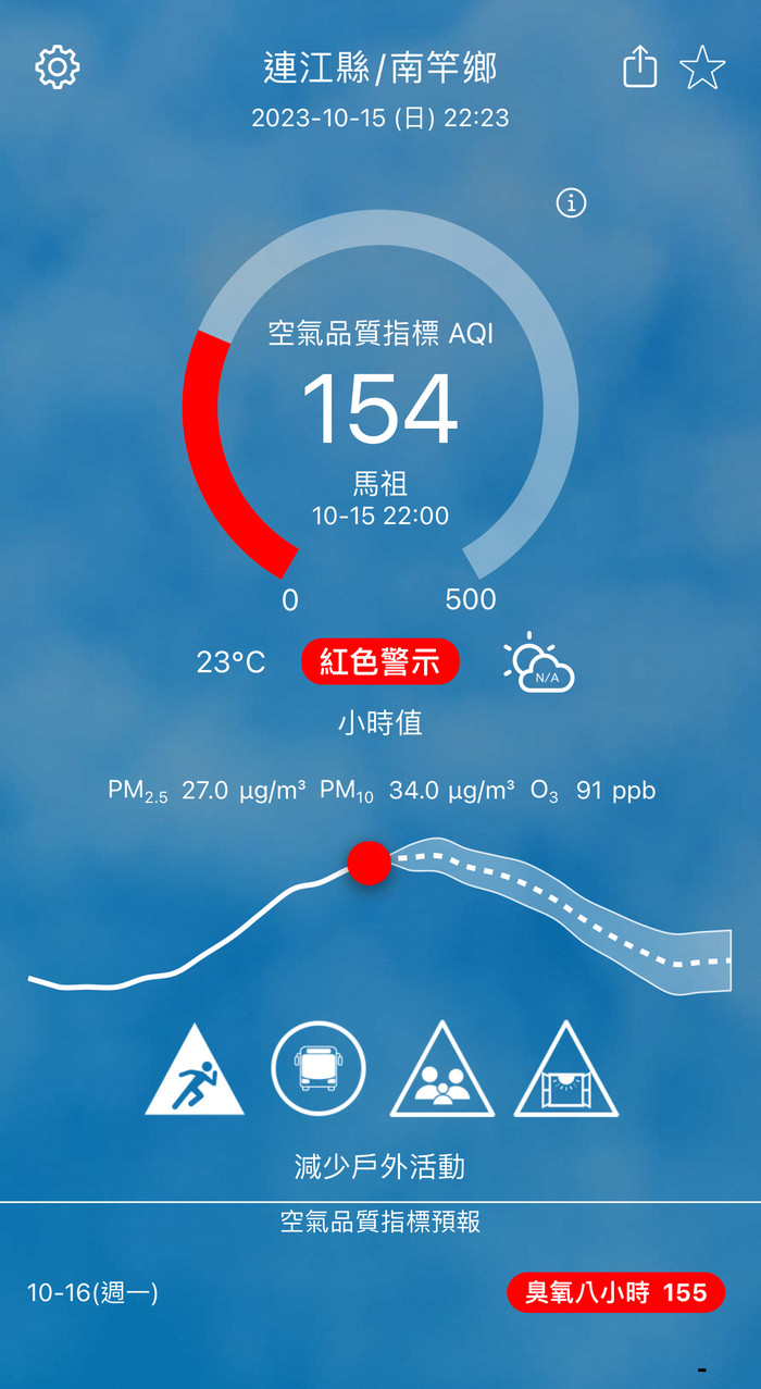下午22時空氣品質監測結果,馬祖地區受境外污染物影響,空氣品質指標AQI為154,對所有族群不健康。另外,本縣設有PM2.5微型感測器,若民眾想了解周遭空氣品質,可至以下位址查詢。