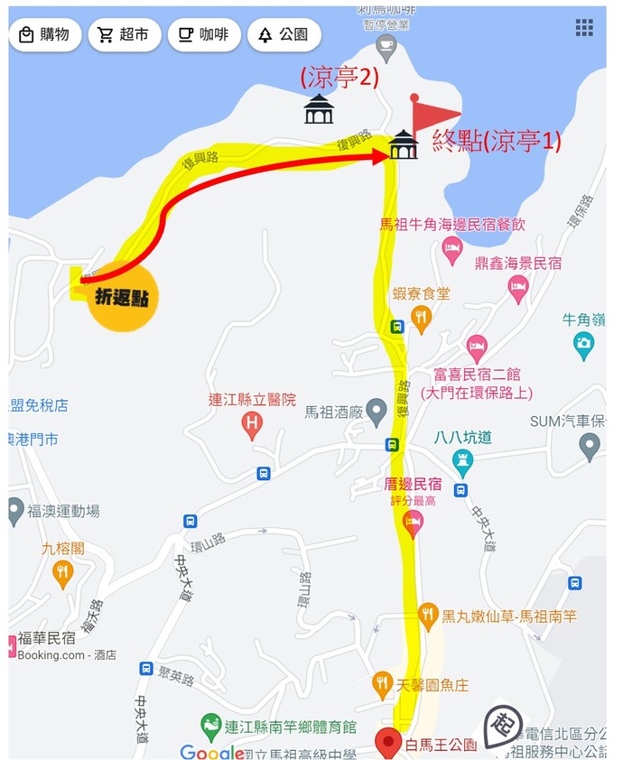 三、 活動時間地點路線:10月21日(週六)上午9點集合,健行路線為(起點)介壽澳口(蓋章、領問卷)→中隴→馬祖酒廠→連江縣議會→復興路→福澳口(折返、蓋章) →刺鳥咖啡路口(填問卷)→第一個涼亭(終點、領紀念品)