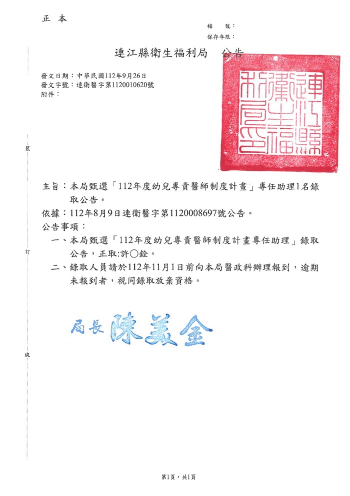 112年幼兒專責醫師制度計畫專任助理錄取公告