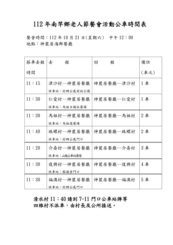 ,請居住在南竿鄉65歲以上年長者們共同參加,另外鄉公所有公車接送,請鄉親於指定時間到指定處所搭車(搭車時間請注意村長廣播)。