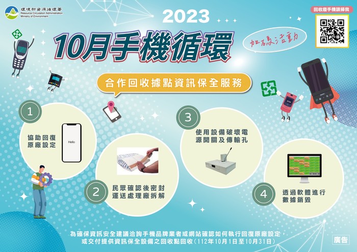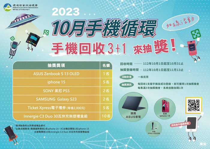 回收手機來抽獎活動期間為10月份期間,於指定時間與地點可用廢手機兌換環境部抽獎序號單,依抽獎序號單上QR-code掃碼或輸入環境部活動網址進入活動網站(https://phonerec.com.tw/),填寫抽獎序號及基本資料,始獲得抽獎資格,環境部活動網站資料登錄開放至11月13日中午12時止。環境部資訊月抽獎獎品為1台筆記型電腦、5支iphome15及2台PS5,每回收一支手機,即獲一個抽獎資格。