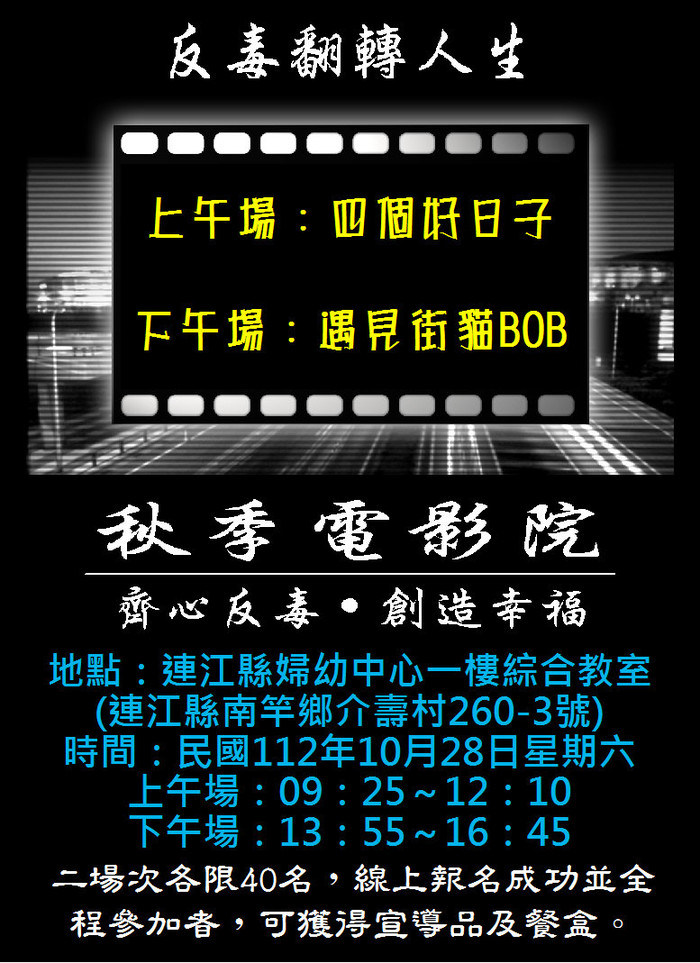 連江縣警察局反毒電影院活動 --閱讀人次 : 933 歡迎各位鄉親好朋友攜家帶眷前來參加
