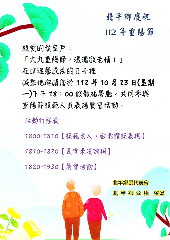 北竿鄉112年重陽節模範人員表揚暨餐會活動,於10月23日(星期一)晚間18時