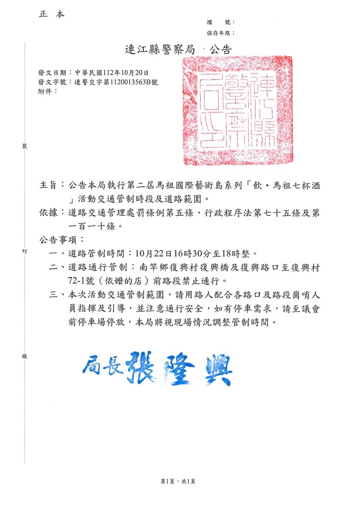 第二屆馬祖國際藝術島「飲‧馬祖七杯酒」活動交通管制公告