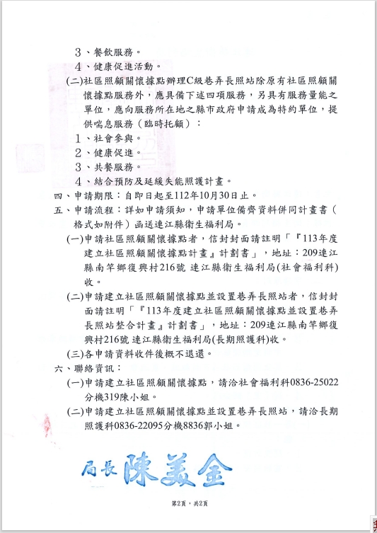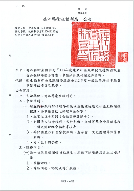 113年據點設罝長照站整合計畫公告 --閱讀人次 : 1395 ◎連江縣衛生福利局113年度建立社區照顧關懷據點並設置巷弄長照站整合計畫: