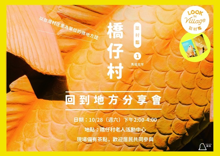 以「村庄里」為單位的 #誌村鑑,首發第一冊《#橋仔村》將於濃濃秋意中,回到馬祖北竿舉辦在地分享會。由想念馬祖到發癢的作者群們,與書中的在地居民交流分享,地方書寫發生在田野現場、發生在生活領域的各種關係。歡迎來到橋仔村,一起聽村民的生活故事、一起走走大小澳口,和嗅聞海風中的各種鹹味。