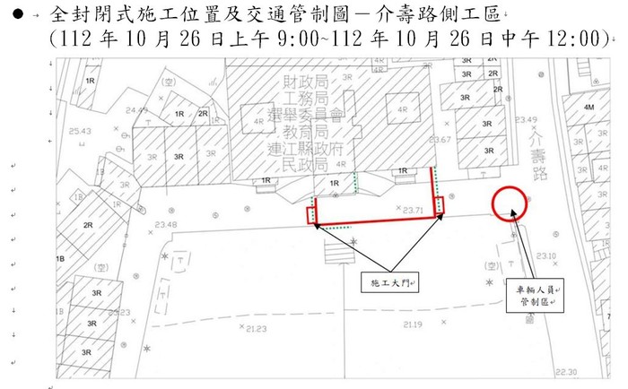 本工程位置位於介壽村連江縣政府大門前,於112年10月26日上午9:00至中午12:00進行混凝土澆置作業,因施工恐影響周邊居民起居及安全等問題,故作業期間採全段封閉施工禁止車輛通行,造成不便,敬請見諒。