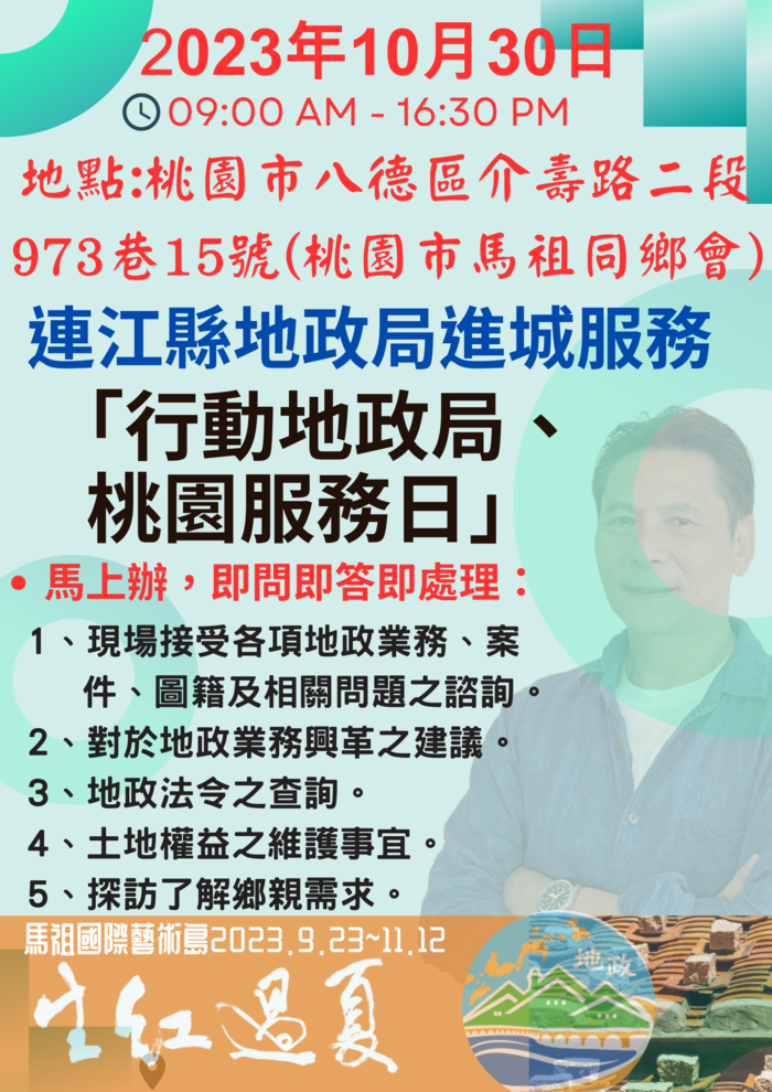 地政局10/30桃園市馬祖同鄉會服務 --閱讀人次 : 569 連江縣地政局,為減輕鄉親洽公之舟車勞頓,從而親近鄉親、建立友善互動交流,已持續辦理各項跨機關橫向合作行動及下鄉在地服務活動,現更為加強精進為民服務,提升服務量能,反映旅台鄉親多有提出回馬洽公辛勞之訴求,將前進馬祖旅台鄉親最多的桃園地區,預定於本(10)月30日(星期一)上午9時至12時、下午1時30分至4時30分,在位於桃園市八德區介壽路二段973巷15號的桃園市馬祖同鄉會館,辦理進城服務-「行動地政局、桃園服務日」活動,現場接受各項地政業務、案件、圖籍及相關問題之諮詢,及對於地政業務興革之建議、地政法令之查詢、土地權益之維護事宜等。地政局表示,本次活動除現場即問即答即處理外,若有需再深入審視討論之個別疑難案件或業務,也會列管登錄查辦後逐一回覆鄉親,同時會視本次進城服務活動辦理實益,及旅台鄉親之需求,作為規劃日後辦理相關行動地政服務活動如何擴大服務項目及範圍之參考。地政局持續秉持縣長盡心為民服務精神,將繼續多方結合與運用各項資源,提供鄉親更多在地及關心服務。