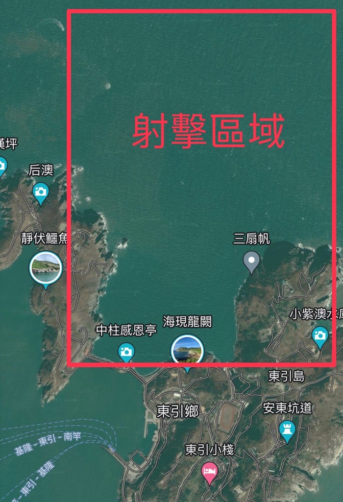 各位鄉親大家好,東引地區指揮部訂於11月8日(三)「日間0830時至1030時」於圖上區域(在北澳海域)實施火砲實彈射擊,請周遭船隻、各式航空器及釣客避免進入射擊區域,以確維安全,造成鄉親不便,敬請見諒。
